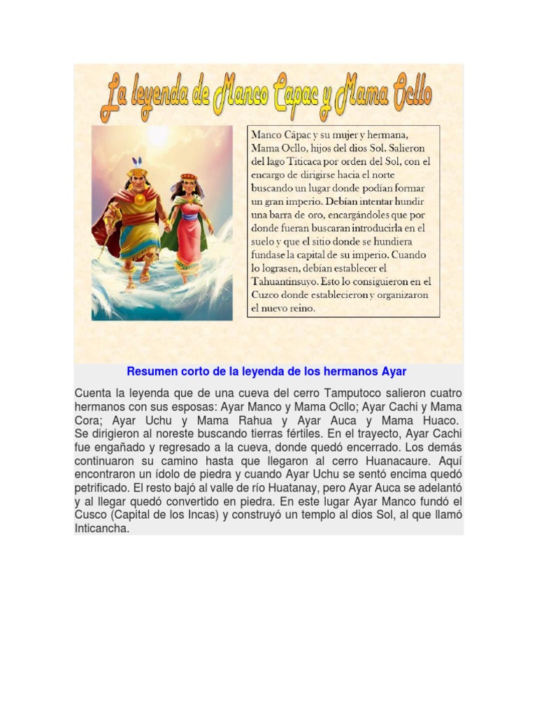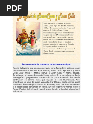 Ayar Manco y Mama Ocllo Ayar Cachi y Mama Huaro Ayar Uch y Mama Ipacura y Ayar Auca y Mama Rahua. Informacin detallada sobre leyenda de los hermanos ayar resumen para nios podemos compartir. Ayar Manco y Mama Ocllo.